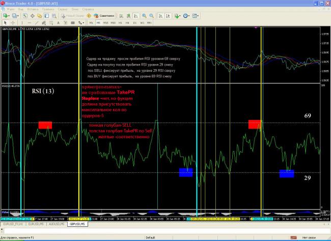 условия для входа в рынок(рассмотрим для покупки)позиция на покупку открывается, лишь при пересечении синей линии снизу, а закрытие позиции при пересечении красной, соответственно позиция SELL открывается при пересечении красной и закрывается как